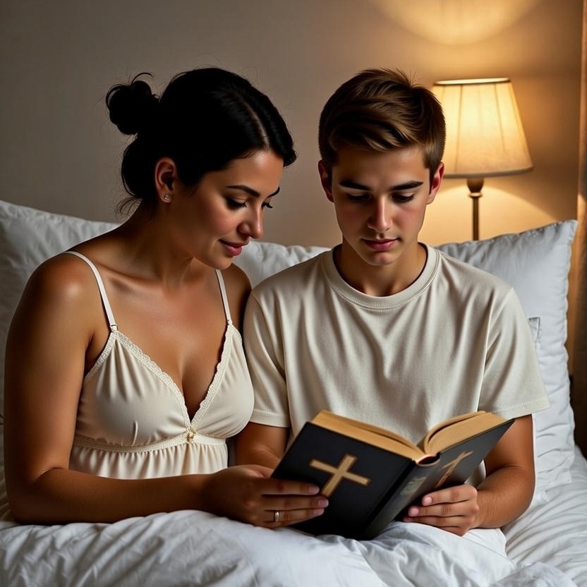 Toen ik verder las, zag ik een lichte trilling in Danny's pyjama en ineens drong het tot me door dat Danny een erectie aan het krijgen was! Mijn puberzoon raakte opgewonden, doordat hij naast mij zat en ik hem streelde! Ik schrok ervan en was er zo door afgeleid, dat ik stopte met lezen. Even later besefte ik, dat ik ook gestopt was met strelen. Maar ik wilde niet dat Danny zich ongemakkelijk zou voelen, dus deed ik net alsof ik moeite had met het uitspreken van een moeilijke naam in het Bijbelverhaal, en ik streelde hem weer verder.