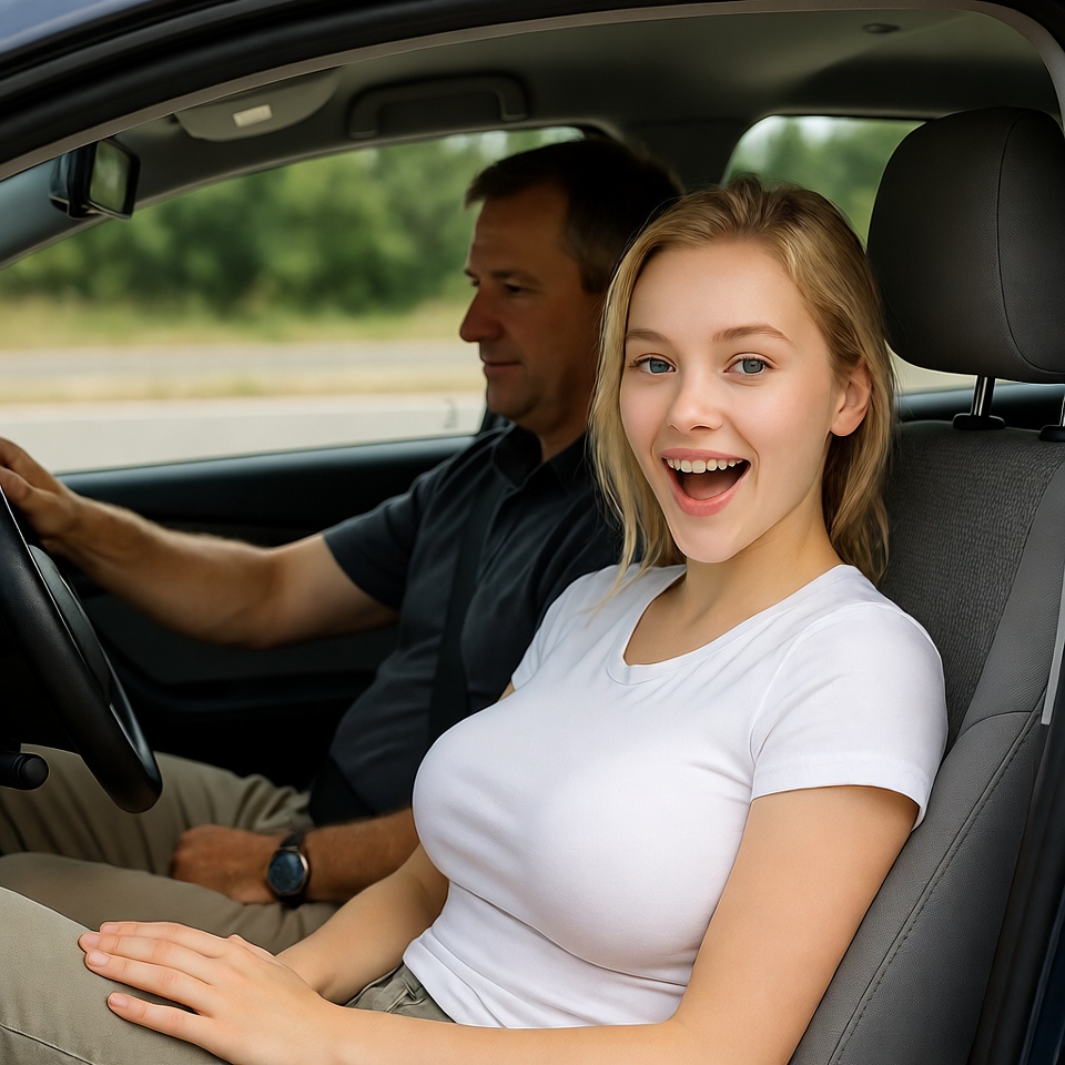 "Angela, ga eens goed zitten en doe je gordel om!" zei hij streng. Ik bewoog mijn hand omhoog langs zijn been en voelde iets in zijn broekspijp. En het bewoog zich onder mijn zachte aanraking!