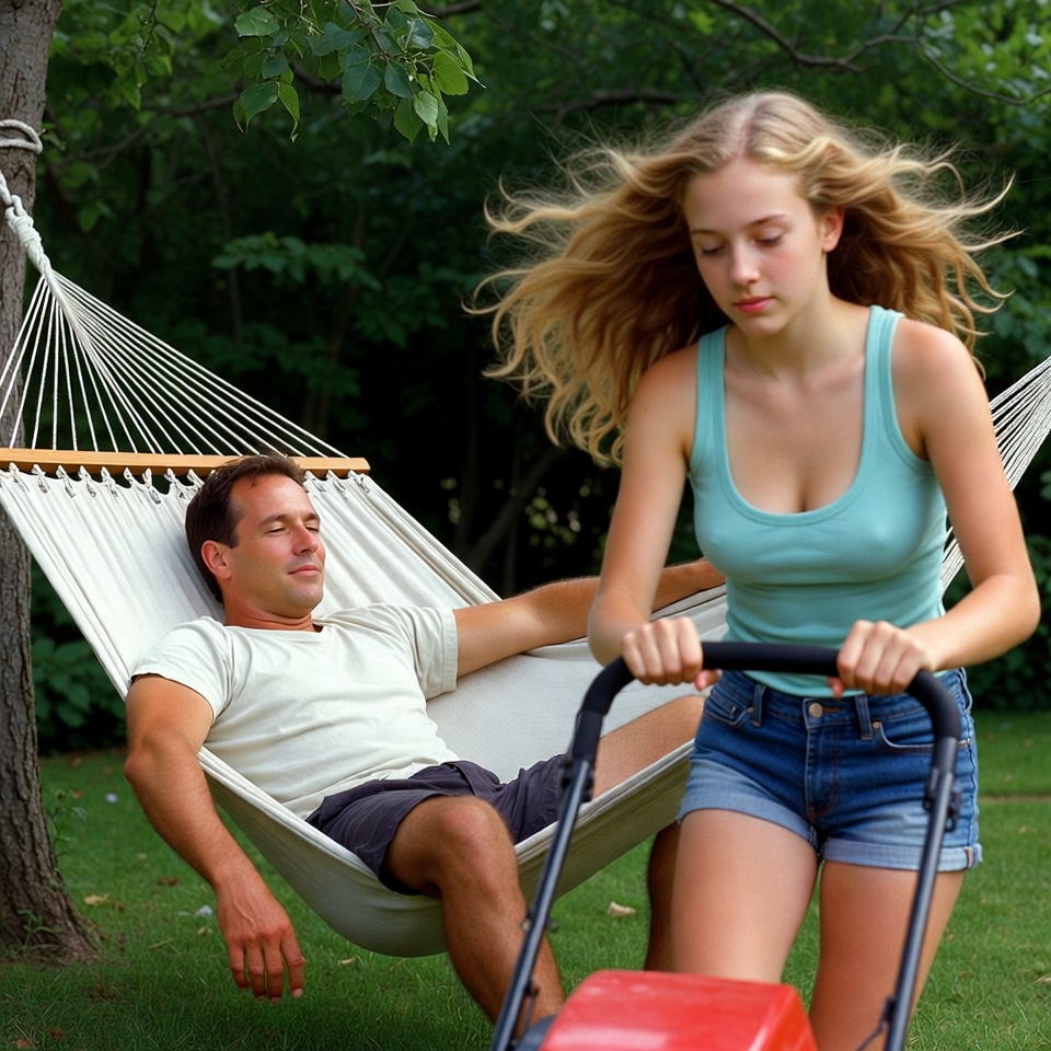 Ik draaide de grasmaaier om en begon de andere kant op te maaien. Buurman Bob zijn blik viel op mijn achterste, twee stevige, uitdagende billen onder de katoenen stof van mijn zomer broek. Mijn rechter bil wipte omhoog wanneer mijn linker bil naar beneden ging en omgekeerd. Op en neer, op en neer, en plotseling zag ik dat oom Bob zijn mond open was gevallen.