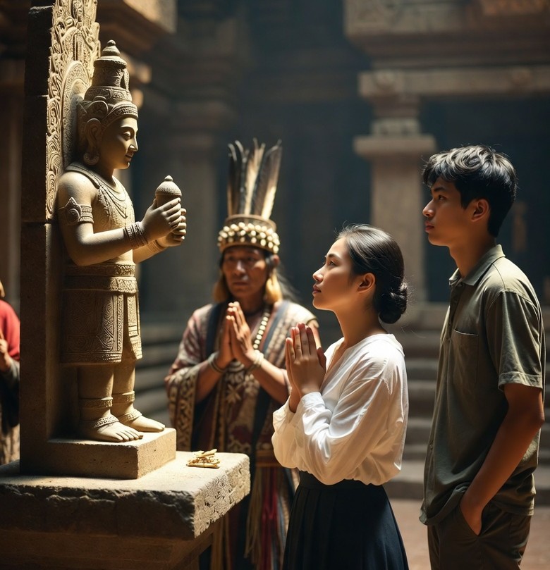 Langzaam stak ik mijn hand naar voren en raakte het vruchtbaarheidsbeeld op het altaar aan, terwijl de zon erop scheen. Ik legde de palm van mijn linkerhand op de opgezwollen buik, terwijl de slanke vingers van mijn rechterhand de borsten en de tepels van het beeld betastten. Ik voelde er een vreemde verbintenis mee, vooral omdat het zonlicht de schoonheid ervan leek te versterken. En alsof het lot het zo wilde, schoof precies op dat moment de wolk boven de tempel weg, waardoor een zonnestraal op het vruchtbaarheidsbeeld viel. Plotseling zag dat oude afgodsbeeld er heel indrukwekkend en stralend uit. Het directe zonlicht dat op het beeld viel, maakte het bijna levend. Ik stond als aan de grond genageld en mijn handen bleven op het beeld liggen.