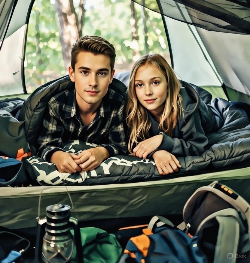 “Stop, nee!” Ik duwde Lisa weg, terug op de haar slaapzak, leunde over haar heen en drukte haar polsen op het grondzeil. Helaas hing er nog steeds een blote borst uit haar nachthemd.