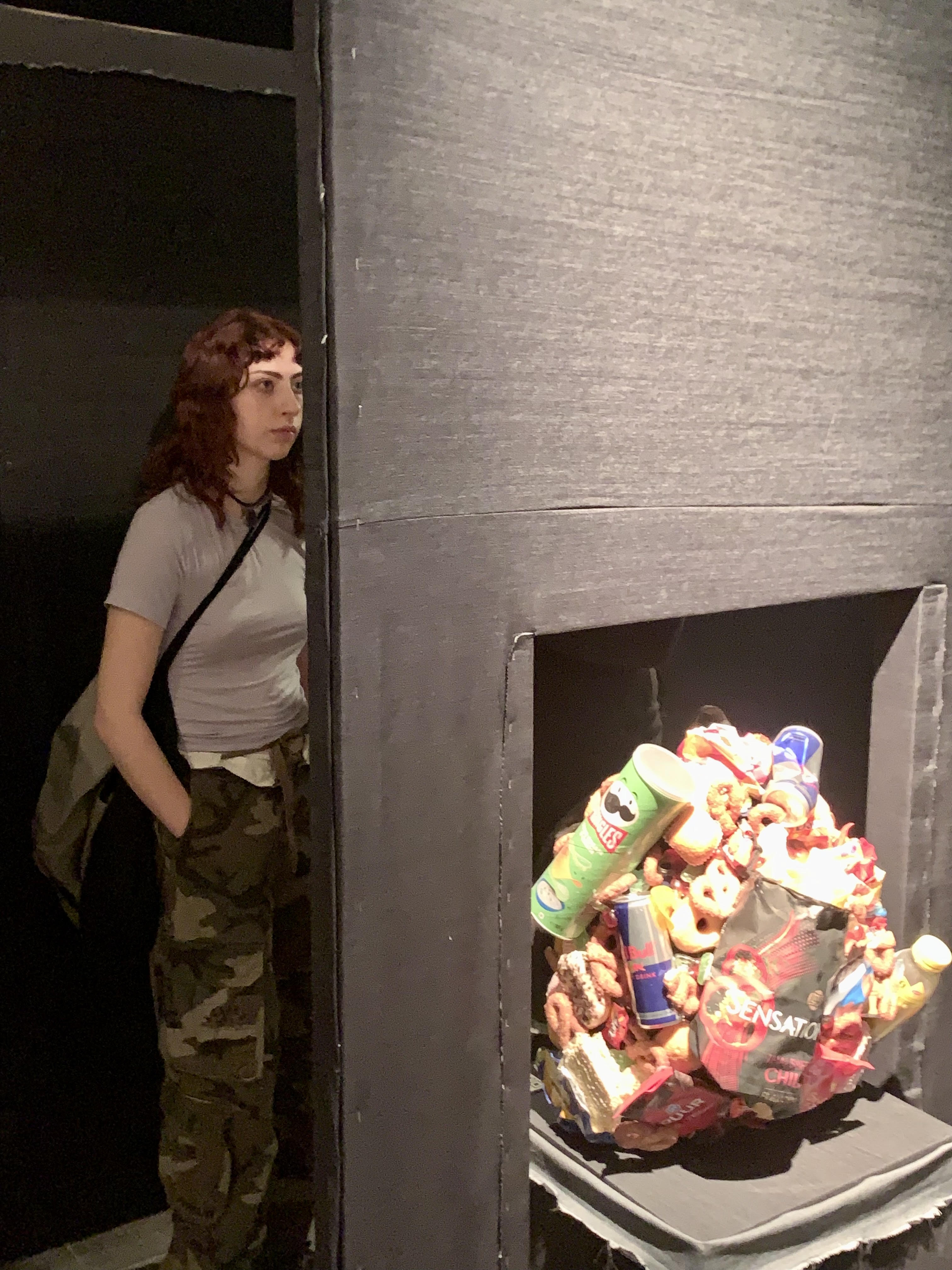 Hoewel vanmiddag pas de officiële opening is loopt het meisje hier totaal op haar gemakje rond, allebei haar handen in de diepe zakken van haar wijde broek. Ze bekijkt in alle rust de verschillende stands en opstellingen, terwijl daar nog hard aan gewerkt wordt. Dít keer laat ik haar niet schieten en ik wil liefst snel van de ladder af klauteren om haar aan te spreken. Maar juist nu ik de moed heb om op haar af te gaan kan dat niet. Ik sta hier op die ladder een grote stage-schijnwerper vast te houden, die mijn collega eerst met allerlei ingewikkelde verbindingen moet koppelen met andere lampen en daarna op de lichtcomputer aansluit, voordat we hem veilig vast kunnen zetten. En hij schiet dus maar niet op, terwijl ik het meisje steeds meer richting uitgang zie gaan. Snel neem ik terwijl mijn collega moppert dat ik mijn hoofd erbij moet houden al balancerend met éen hand een foto van haar, om in ieder geval nog iets van haar te hebben.