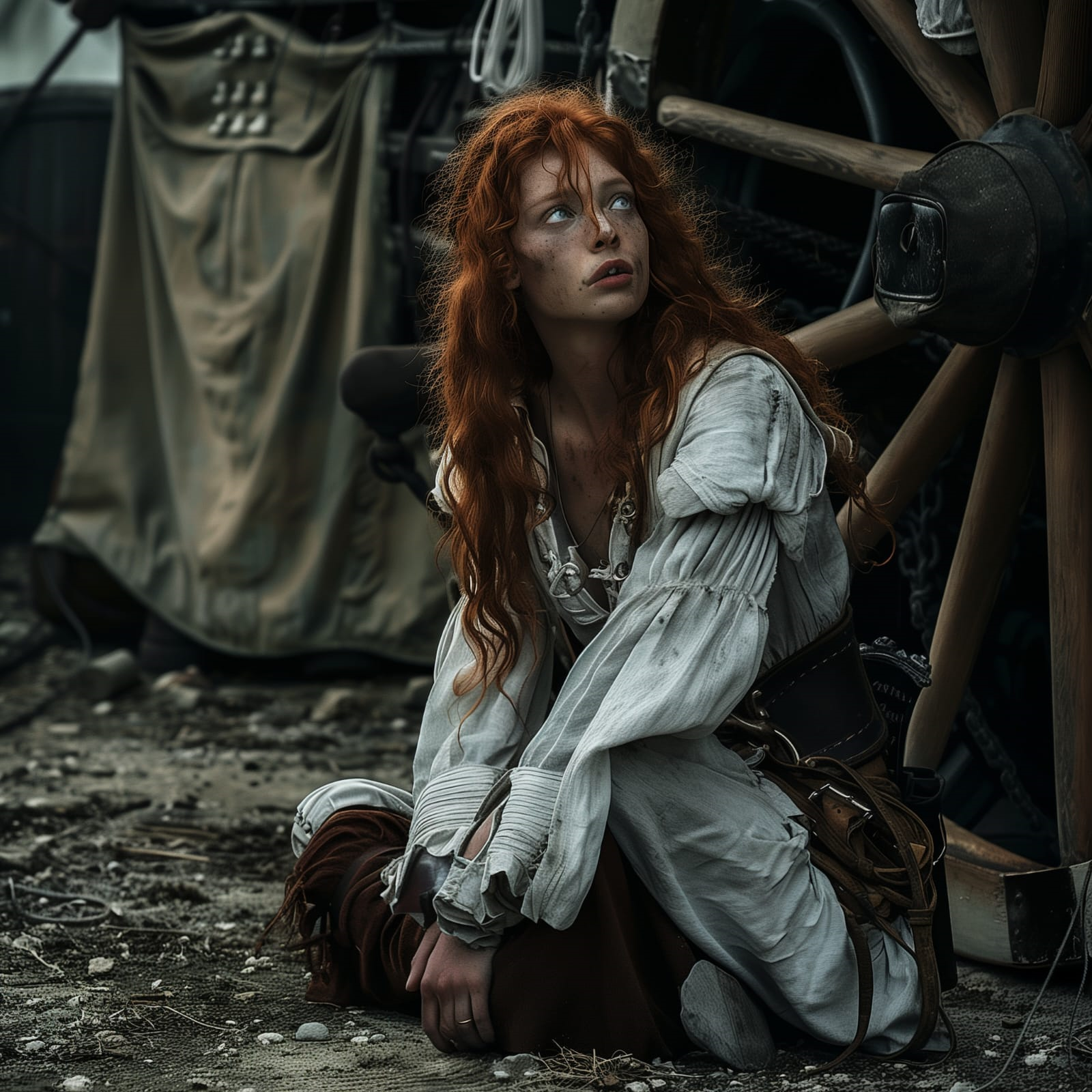 Hij sleept me mee naar een achterwiel van het rijtuig. Behendig boeit hij mijn handen met een dik touw en maakt hij mij vast aan één van de wielen van de wagen. Diederik loopt weg bij me.