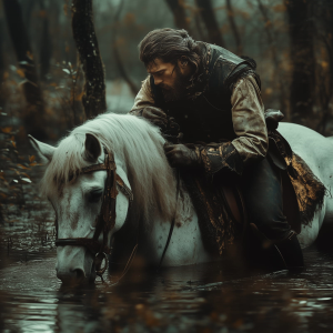 “We moeten verder lopen,” maant Willem de anderen aan. We laten ons allemaal in het water zakken en trekken onze paarden bij de teugels verder. Enkel Koenraad blijft op zijn paard zitten. Eigenlijk legt hij zich voorover om op die manier toch wat rust te vinden. Sophia neemt meteen de teugels van zijn paard vast. Het is mooi hoe een groep mensen steun vindt bij elkaar.