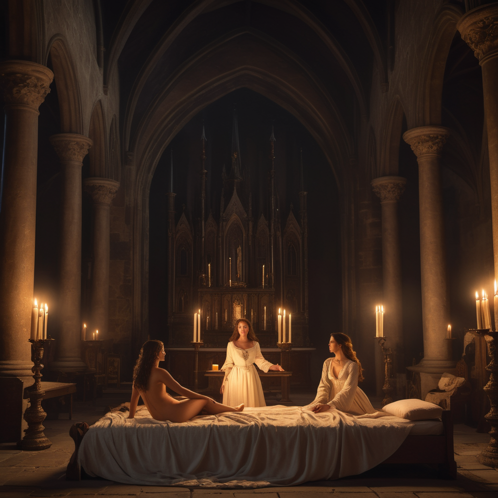 Ik kijk om. Francisca ligt wijdbeens op het altaar. Haar naakte lijft ligt glanzend in het schijnsel van het kaarslicht en de fakkels! Haar gitzwarte haren en bleke huid vormen een prachtig contrast met elkaar. Haar natte kutje is naar ons toe gericht terwijl Hieronimus over haar heen gebogen staat en haar borsten streelt en haar tepels likt en zuigt. Haar tepelaureolen zijn nat van zijn speeksel.