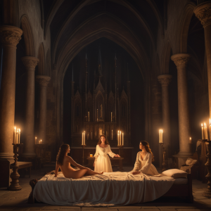 Ik kruip van het bed af en neem Yda mee. Ik ruk haar los van Arnoud. Mijn kin is nog steeds nat van het pijpen. We kruipen met onze lichamen tegen elkaar aan, huid tegen huid, terwijl de mannen ons bekijken. Misschien tintelt er een licht gevoel van jaloezie door hun aderen. Gewoon een beetje plagen om het verlangen in ons nog groter te maken. Ik fluister iets in Yda's oren en ze knikt begrijpend. Het gekreun op het altaar zwelt aan en wordt steeds intenser.