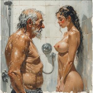 Wat maakte me dat nieuwsgierig, en gaf me ook nog kriebels in mijn buik. Een raar gevoel. Dat vraag ik volgende keer wel aan opa. Die morgen zat ik er nog aan te denken. Ik sprong uit bed en besloot Roger te gaan begluren bij de douches. Het was even wachten maar ik werd beloond en zag Roger met zijn toiletzakje en handdoek naar de douches stappen. Het was nog redelijk vroeg en dus is de kans klein dat ik zou worden betrapt. Ik sprong de douchecabine naast hem binnen en wachtte dat het water begon te stromen. Ik had een spiegeltje meegenomen zodat ik langs de opening onderaan kon binnengluren.