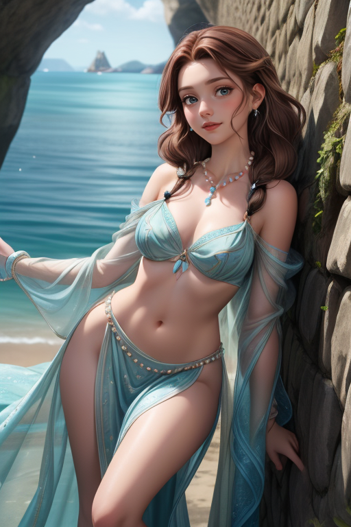 Elara's sieraden waren eenvoudig maar toch betoverend. Een lange ketting met een schelphanger bungelde zachtjes tussen haar volle borsten, terwijl parels en zilveren kettingen haar armen sierden. Alles wat ze droeg leek een verhaal te vertellen, een verhaal van ontdekking en avontuur. Haar sieraden waren symbool voor haar rusteloze aard - de drang om altijd nieuwe sensaties, nieuwe plekken, en nieuwe verlangens te ontdekken.