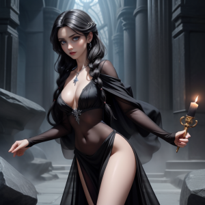 Zelfs zonder een woord te spreken hing er een onmiskenbare kracht om haar heen. Haar zwarte, doorschijnende gewaad streek als golvend schaduwzijde langs haar lichaam, verleidelijk gevormd en angstaanjagend tegelijk. Haar lange, gitzwarte haar gleed als een donkere waterval langs haar schouders, een contrast dat haar bleke huid nog lichter deed lijken. Over haar hals en armen droeg ze zilveren sieraden die flonkerden als sterren, alsof ze zelf een stukje nacht met zich meedroeg. Toen hun blikken elkaar ontmoetten, voelde Elsa een mengeling van verwondering, huiverende angst en onverklaarbare verleiding. Het was alsof Sarnara dwars door haar heen keek, tot in het diepst van haar wezen.