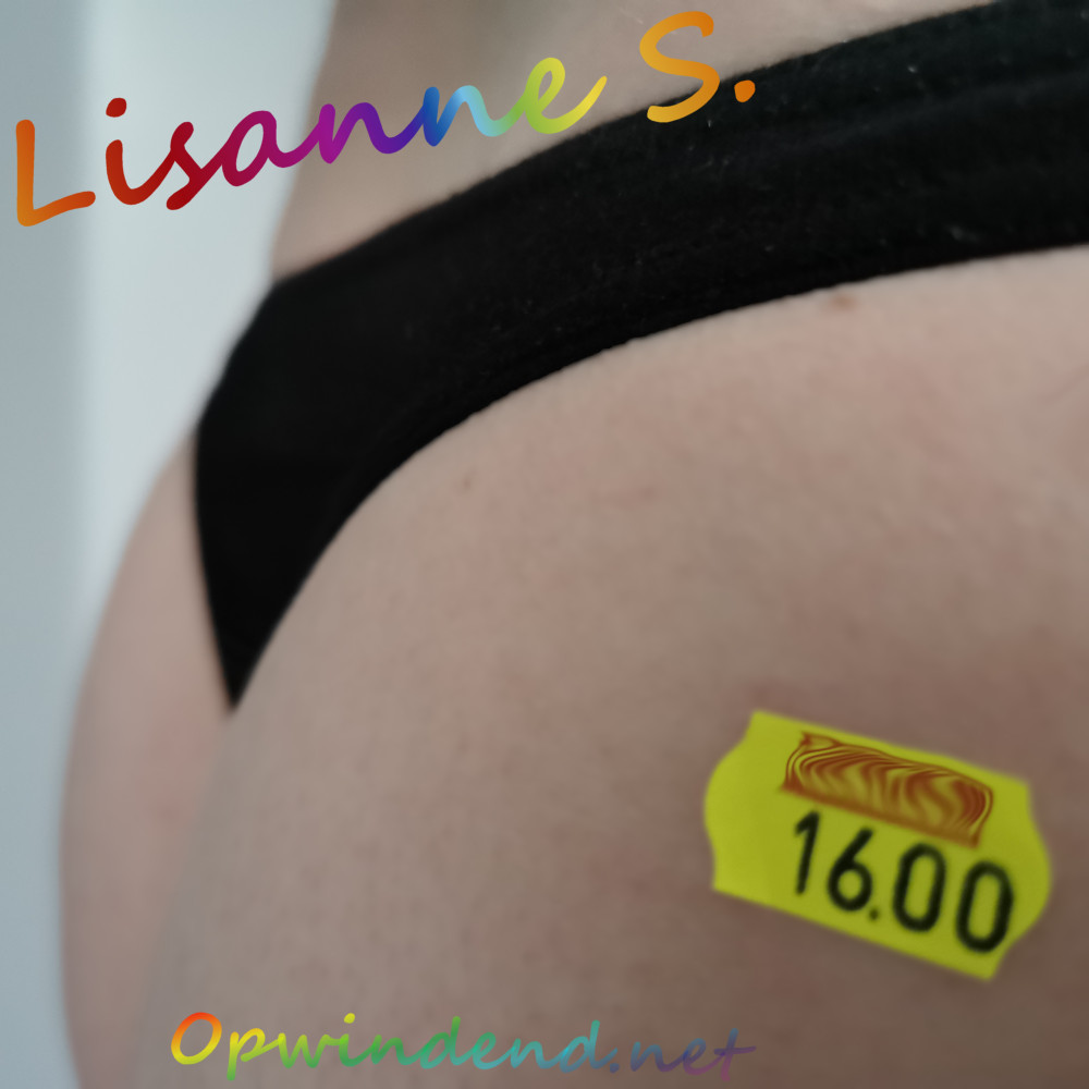 Over de foto: Ik plaats sinds het najaar van 2025 foto's bij mijn verhalen, maar in plaats van een willekeurig pornoplaatje van internet te plukken, maak ik de foto's die ik bij mijn verhalen gebruik zelf. Naast het feit dat ik het leuker vind om passende foto's bij verhalen te zien in plaats van willekeurige porno, is het bedenken en maken van de foto's ook nog eens een leuke bezigheid als aanvulling op het schrijven van de verhalen zelf. :) In dit geval kocht ik iets van €16, met nog een 'oldschool' prijsstickertje er op. Aangezien Lynn in de verhalen 16 is, en zichzelf verkoopt, besloot ik het stickertje op mezelf te plakken. ;)