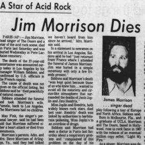 Hij leest hardop, zijn stem begint te trillen, heel lichtjes, alsof de lucht zelf om hem heen bevriest. "20 jaar geleden stierf Jim Morrison." Zijn stem stokt bij zijn eigen naam. De wereld staat even stil. Zijn gezicht verstijft, alle sporen van spot en amusement verdwijnen, vervangen door pure, rauwe shock. Boven de tekst staat een foto. Een zwart-wit portret. Zijn eigen gezicht. Zijn kenmerkende lange haar, zijn intense blik, die hij duizend keer heeft gezien in spiegels en op platenhoezen. Maar deze foto staat boven een bericht over zijn dood. Hij kijkt op, zijn ogen zijn immens groot, vol ongeloof, vol verschrikking. De lounge, de drugs, de chaos buiten – alles vervaagt. Alleen dit papier telt. Dit bericht uit een tijd die nog niet is gekomen, over een gebeurtenis die nog niet heeft plaatsgevonden.