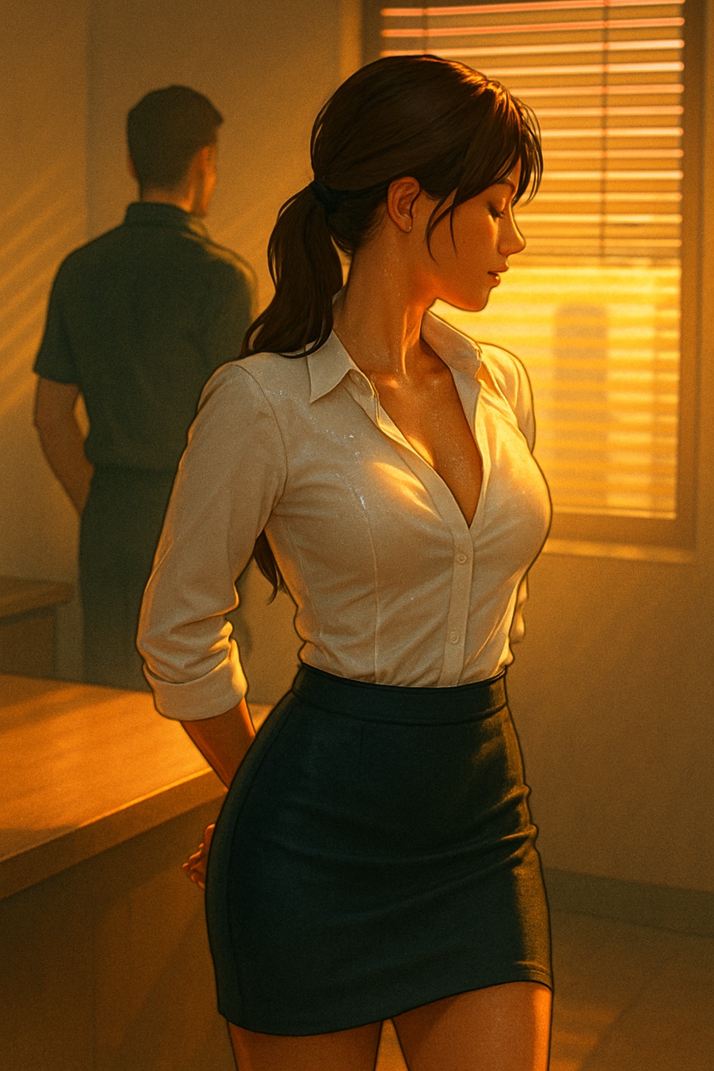 Ze draagt een kokerrok vandaag. Donkergrijs, hoog aangesloten. En erboven een wit overhemd dat strak over haar borsten valt, de bovenste knoop los, net genoeg om haar sleutelbeenderen te zien. Haar haar — bruin, dik — zit in een hoge, lange staart. Ze steekt perfect recht omhoog voor het langs haar rug omlaag valt. Ze lijkt zelfverzekerd. Maar iets aan haar ogen verraadt dat ze voelt dat er iets speelt.
