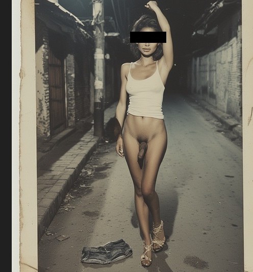 Het was allemaal zo vreemd. Ik had nog nooit een T-meisje van dicht gezien en nu zag ik, achter haar geschoren zwarte driehoekje geen poesje, maar de zwelling van een penis. Het kwam me allemaal zo verwarrend over. Even later stapte ze uit haar broekje en toonde ze me haar penis. Ze maakte zich op geen enkel moment zorgen over het feit of ze gezien zou worden. Ze toonde me haar perfecte kontje. Ik kon mijn ogen niet van haar borsten, billen en vooral haar penis afhouden. Ze poseerde terwijl ik foto’s nam. Eén van deze foto’s is de foto die je hier ziet.