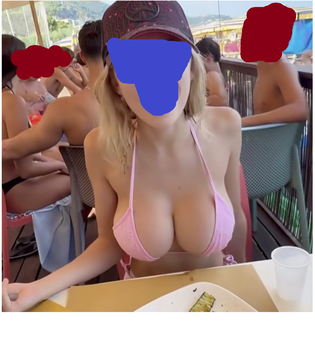 Ik aarzel, sta wat bedremmeld te kijken, dan trek ik mijn topje uit. Mijn borsten zijn nu bloot, ik voel hoe ze hard zijn, maar het voelt heerlijk, de wind op mijn stijve tepels. Ik zie de mannen nu openlijk kijken, bewonderend. Ik heb dan ook hele mooie borsten, mag ik dat zeggen? Ik doe mijn shortje uit en ik sta hier in mijn bikinibroekje. Ik voel hoe ik nat ben tussen mijn benen. Ik besluit mijn broekje nog wat aan te houden. Het is voor het eerst dat ik in mijn blote borsten zit en me bloot toon aan mensen. Het is echt onwennig.