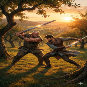In een boomgaard in de vallei weerkaatst het licht van de ondergaande zon op een metalen lemmet. Er wordt gevochten tussen de appelbomen! In eerste instantie zet ik het op een rennen, maar al snel zie ik dat het slechts twee mannen zijn die vriendschappelijk sparren. Geen serieus gevecht, gelukkig. Vals alarm. Ik berg mijn zwaard weer weg en volg een zandpad in de richting van de boomgaard.