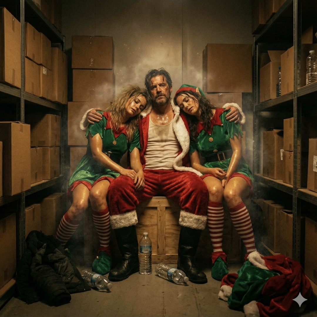 "Tijd om het echte cadeau uit te pakken," fluistert Kathleen. Haar stem trilt van ingehouden ongeduld. Ze laat haar handen van zijn enkels langzaam omhoog glijden, over de ruwe stof van de rode broek. Haar vingers haken achter de tailleband. Claus houdt zijn adem in. Hij voelt haar knokkels tegen zijn onderbuik drukken, warm en dwingend.