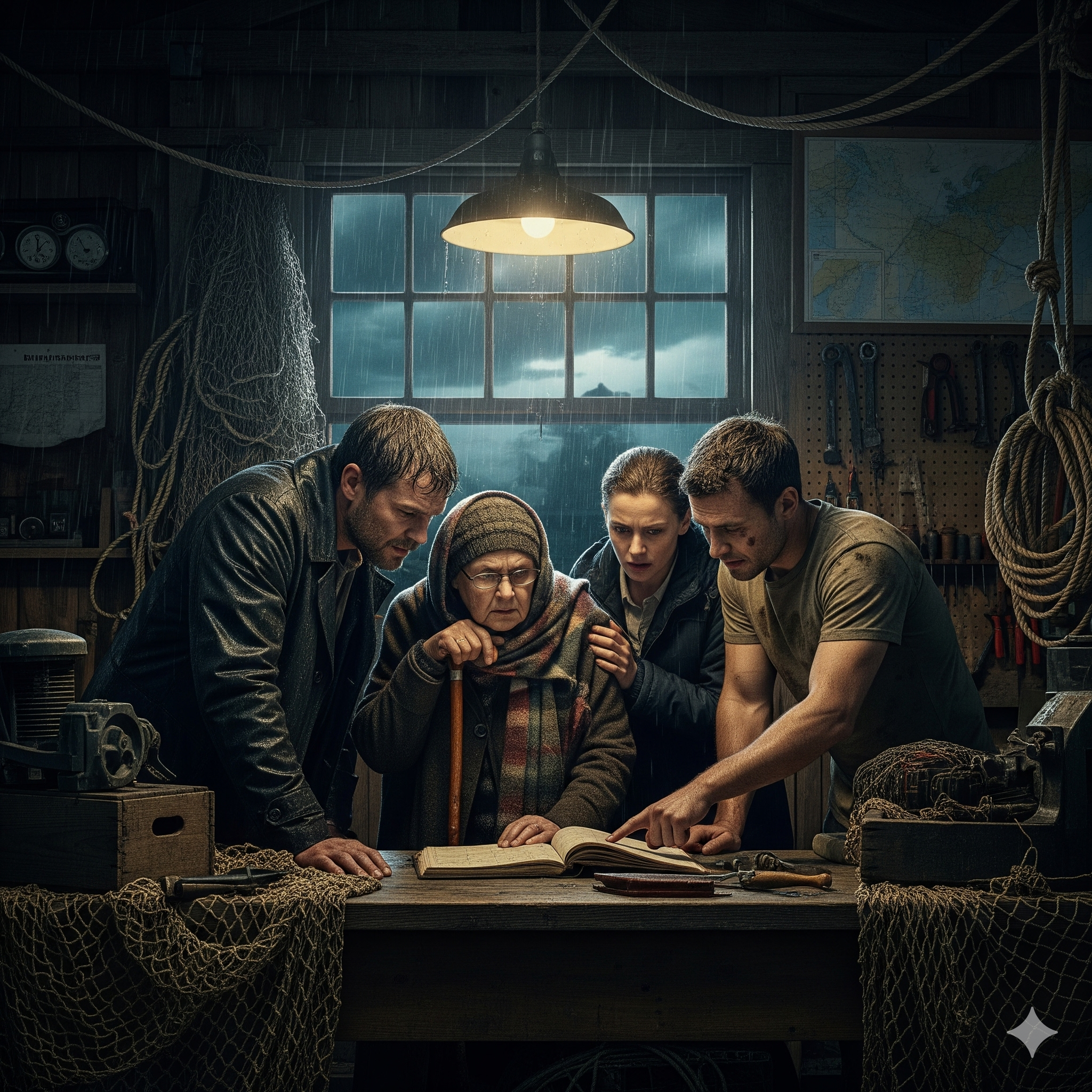 "We hebben geen tijd voor het verleden," breekt Wolf in, zijn geduld is op. Hij stapt naar voren, zijn natte jas druppend op de vloerplanken. Het water vormt een donkere plas rond zijn laarzen. "Ze zocht een lied. Een specifiek vers dat de locatie beschrijft. Simone zegt dat je opa aantekeningen had. Waar zijn ze?"
