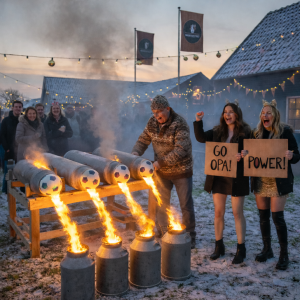 Wat een heerlijk vooruitzicht. Carbid schieten is echt zo'n traditie die de winterse sfeer perfect samenvat: de geur van acetyleengas, die doffe dreun die je in je borstkas voelt, en natuurlijk de gezelligheid die eromheen hangt. Het feit dat het op een eigen "bierderij" is met een privé-café maakt het helemaal af. Dat is toch de droom van elke man met een beetje ruimte?