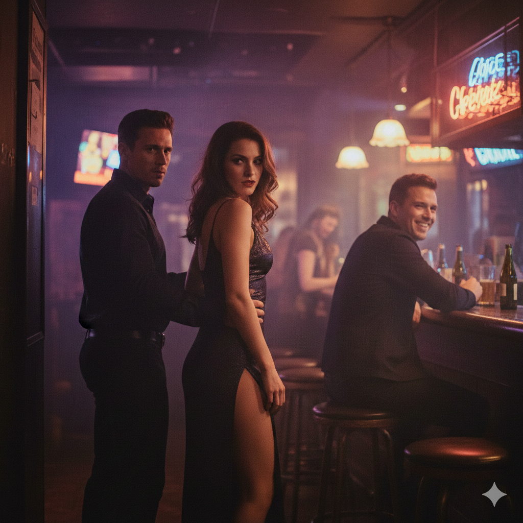 De bar was gevuld met het geluid van rammelende glazen en een diepe bas die door de vloer trilde. Ik zat aan de rand van de bar toen ik haar zag; ze straalde een zelfverzekerdheid uit die me direct uit mijn ritme haalde. Ondanks dat ze daar met haar vriend stond, zocht ze met een ondeugende glinstering in haar ogen contact.