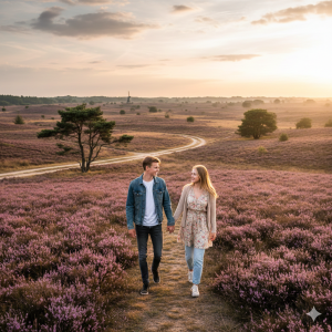 Ze zetten koers over de uitgestrekte paarse heide, de lucht nog fris vanwege de ochtendzon. Ze kletsten honderduit tijdens de wandeling. Thomas vertelde over zijn klus bij de supermarkt: schappen vullen, klanten helpen, geld bij elkaar schrapen voor z’n rijbewijs en vervolgstudie. 'Niet bepaald rock 'n roll, maar het betaalt de rekeningen,' grinnikte hij. Sandra deelde haar passie voor dieren, over het poetsen van honden en katten in het asiel, en hoe ze fantaseerde over haar eigen dierenopvang. 'Dieren liegen niet, ze zijn puur – geen bullshit zoals bij ons mensen,' plaagde ze hem. Muziek, films, ze hadden overlap zat. De kilometers vlogen voorbij; na meer dan twee uur wandelen waren hun benen zwaar, maar de vibe tussen hen knetterde al. Hun vingers streken langs elkaar, blikken hingen langer dan nodig.