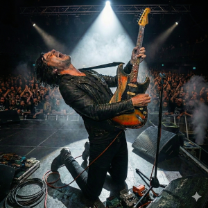 Het applaus dat volgt is oorverdovend en overstemt alles. Maar Chris is nog lang niet klaar. Hij kijkt Mark aan en knikt driftig. De band ramt meteen door in de volgende track. Ze spelen alsof hun leven ervan afhangt, nummer na nummer, tot ze eindigen met de furieuze afsluiter Burn It Down. Chris schreeuwt de longen uit zijn lijf, gooit zijn gitaar bijna in het publiek en laat de feedback gieren. Pas als de laatste echo wegsterft, richt Chris zich langzaam op, hijgend en trillend van de adrenaline. Hij kijkt nog één keer naar haar, een intense blik die belooft dat dit nog maar het begin is, en draait zich dan om. Hij zwaait kort naar de zaal, gooit zijn handdoek in het publiek en verdwijnt met de rest van de band in de donkere coulissen.