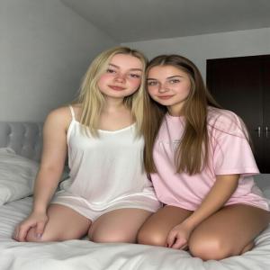 Fleur en ik gingen aan weerszijden van hem op de rand van het bed zitten, onze lichamen dicht tegen hem aan, de spanning hing in de lucht. We leunden tegelijk naar voren en gaven hem allebei een kus op zijn wang, zacht en plagend, onze lippen op zijn gladgeschoren huid. Alex zei met een ondeugende toon: "Geef elkaar ook maar een lief kusje." Fleur en ik bogen naar elkaar toe over Alex's schoot heen, onze gezichten dichtbij, en we gaven elkaar een kus op de lippen... en nog een kus... en toen werd het een tongzoen, onze tongen dansend, proevend, terwijl we elkaar recht voor hem zoenden. Ik voelde Alex's hand over mijn rug strelen, warm en stevig, en ik zag dat hij hetzelfde bij Fleur deed, zijn vingers gleden over haar dunne roze nachthemdje. "Heel goed meisjes," gromde hij goedkeurend, zijn stem laag en vol lust.