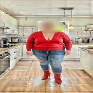 Ik draaide me half om, deed alsof ik de pan wilde oppakken, maar eigenlijk wilde ik alleen maar dat ze het zouden zien. Ik boog voorover, langzaam, expres. Mijn rode trui zakte naar voren, de diepe V-hals viel open en mijn borsten hingen zwaar in de zwarte kanten bh die ik eronder droeg. De stof rekte strak, mijn tepels priemden erdoorheen – van de kou buiten, maar vooral van wat er nu gebeurde. Inkijk, volle inkijk. Ik bleef zo een paar seconden hangen, deed alsof ik iets van de grond raapte, voelde hun ogen branden op mijn decolleté.