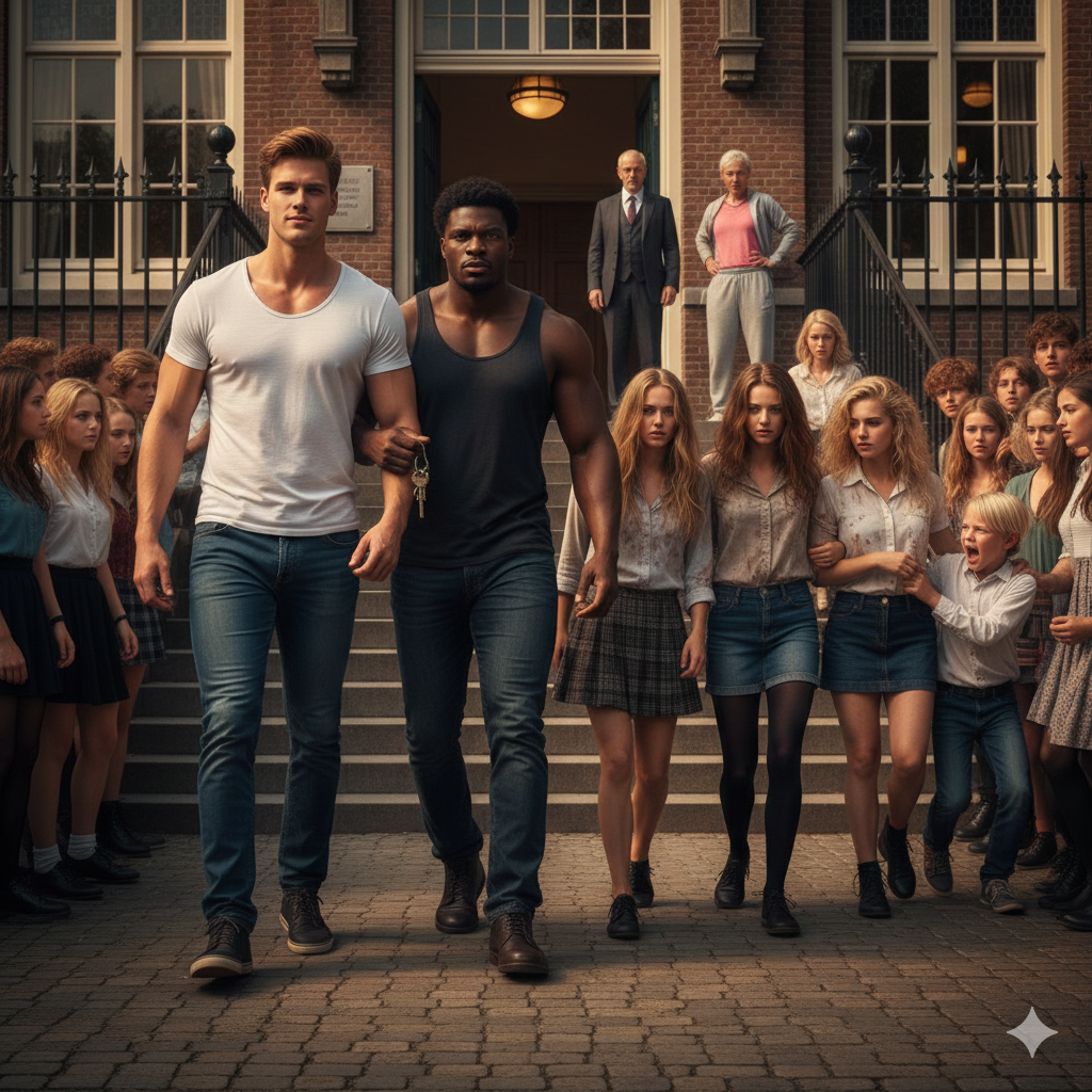 "Niet zo snel, kleine rat," zei ik, terwijl ik mijn hand als een bankschroef om zijn nek klemde. "Je had net een grote bek tegen de lerares over onze 'privéles'. Het wordt tijd dat je met je eigen ogen ziet waarom wij hier de dienst uitmaken."