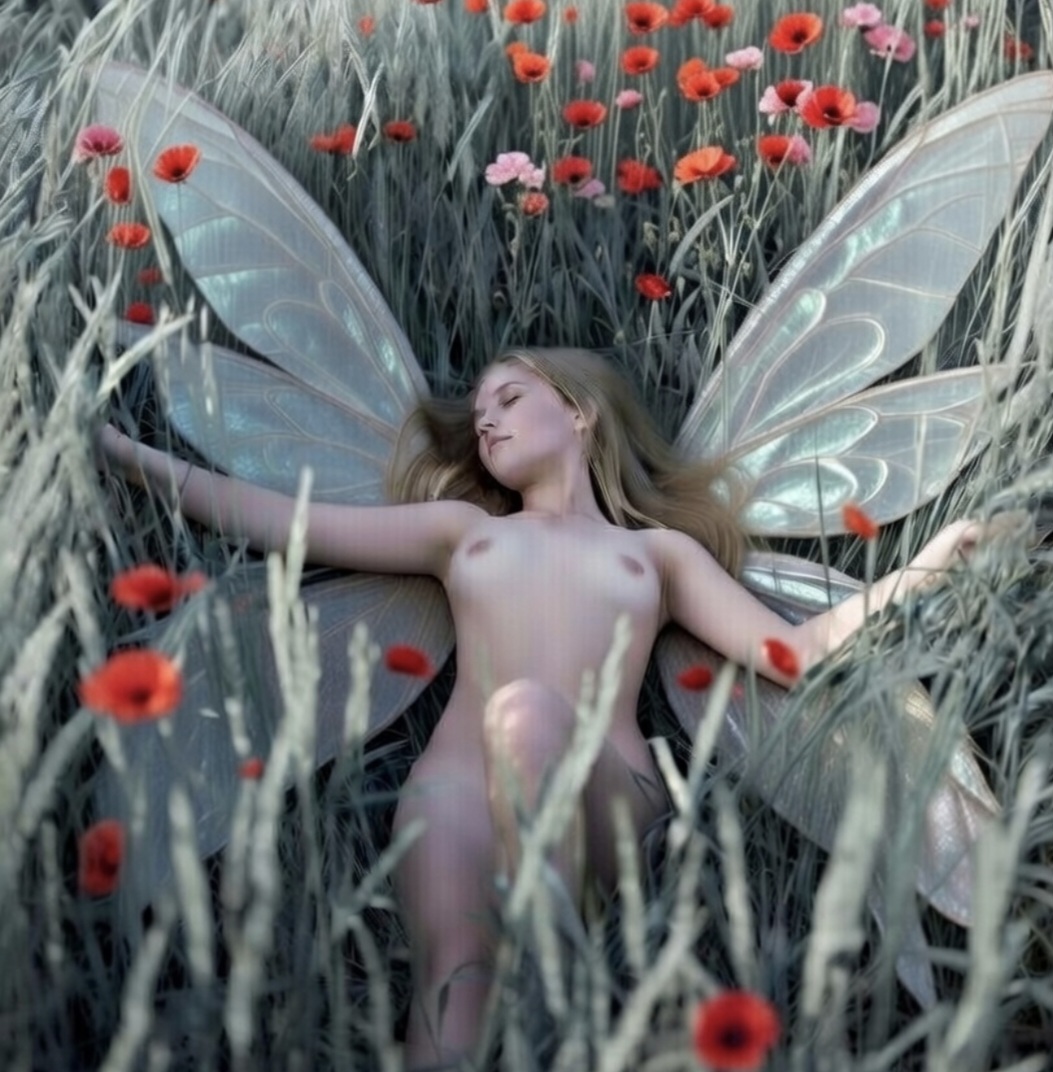 Het gras streelt langs mijn benen als ik loop, het kietelt de binnenkant van mijn dijen en hoger, tot aan mijn schaamlippen. Het kietelt de randen van mijn vleugels. ik spreid ze om er nog meer van te voelen en het stuurt tintelingen door mijn hele lijf, ik trek ze snel weer in, giechel en sla ze weer uit om weer gekieteld te worden, een speels spel dat me opwindt. Overal waar ik sta beginnen bloemen te bloeien, ze ontluikend uit de grond met een zachte gloed, hun bloemblaadjes pulseren en hebben een bedwelmende zoete geur die ik niet kan weerstaan. ik ga liggen in het hoge gras, mijn naakte lichaam zinkt in de zachte zilveren halmen, mijn vleugels liggen uitgespreid onder me. Het doolhof zelf komt tot leven en verwent me als een minnaar. ranken groeien uit de grond, dun en zacht al zijde, ze strelen over mijn huid, beginnend bij mijn voeten en enkels ze wikkelen zich zachtjes om ze heen. Ze glijden hoger en kietelen mijn dijen tot ik mijn benen spreid. Een rank duikt tussen mijn schaamlippen, streelt over mijn clitje en laat een dik, warm tintelend vocht achter. Andere ranken verkennen mijn borsten, wikkelend zich om ze heen en kneden ze zacht, aan hun de uiteinden groeien bloemen die aan mijn tepels zuigen als kleine mondjes.