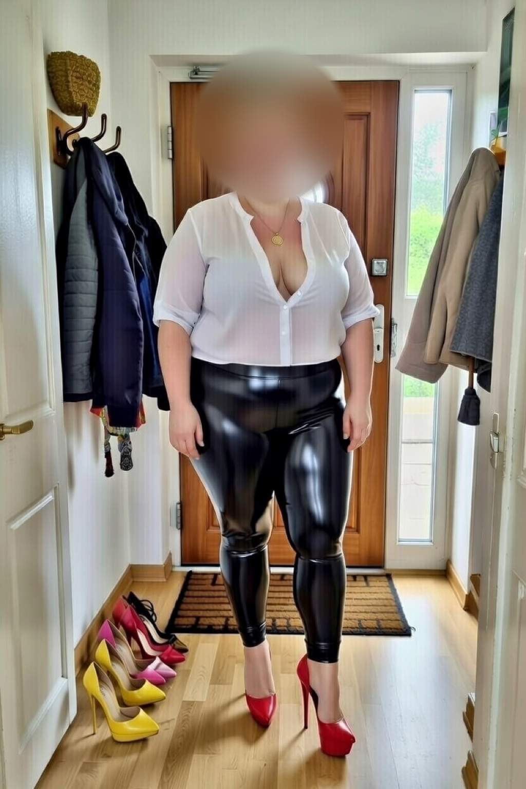 Daaronder – of eigenlijk erboven, want hij zit strak als een tweede huid – mijn zwarte glimmende legging. Niet zomaar een legging. Deze is van dik, glanzend vinyl, bijna lak, met een hoge taille die mijn buik zacht inpakt en mijn heupen en billen mooi afrondt. Hij glanst als natte inkt in het licht, elke beweging laat hem glinsteren en strak trekken over mijn dijen. Ik voel hem bij elke stap: hoe hij knispert, hoe hij mijn huid omsluit, hoe hij mijn kont iets meer laat deinen dan normaal. Het is een kledingstuk dat niet verbergt. Het pronkt. Het zegt: kijk maar. Ik ben er. Ik ben nog steeds een vrouw die begeerd wil worden.