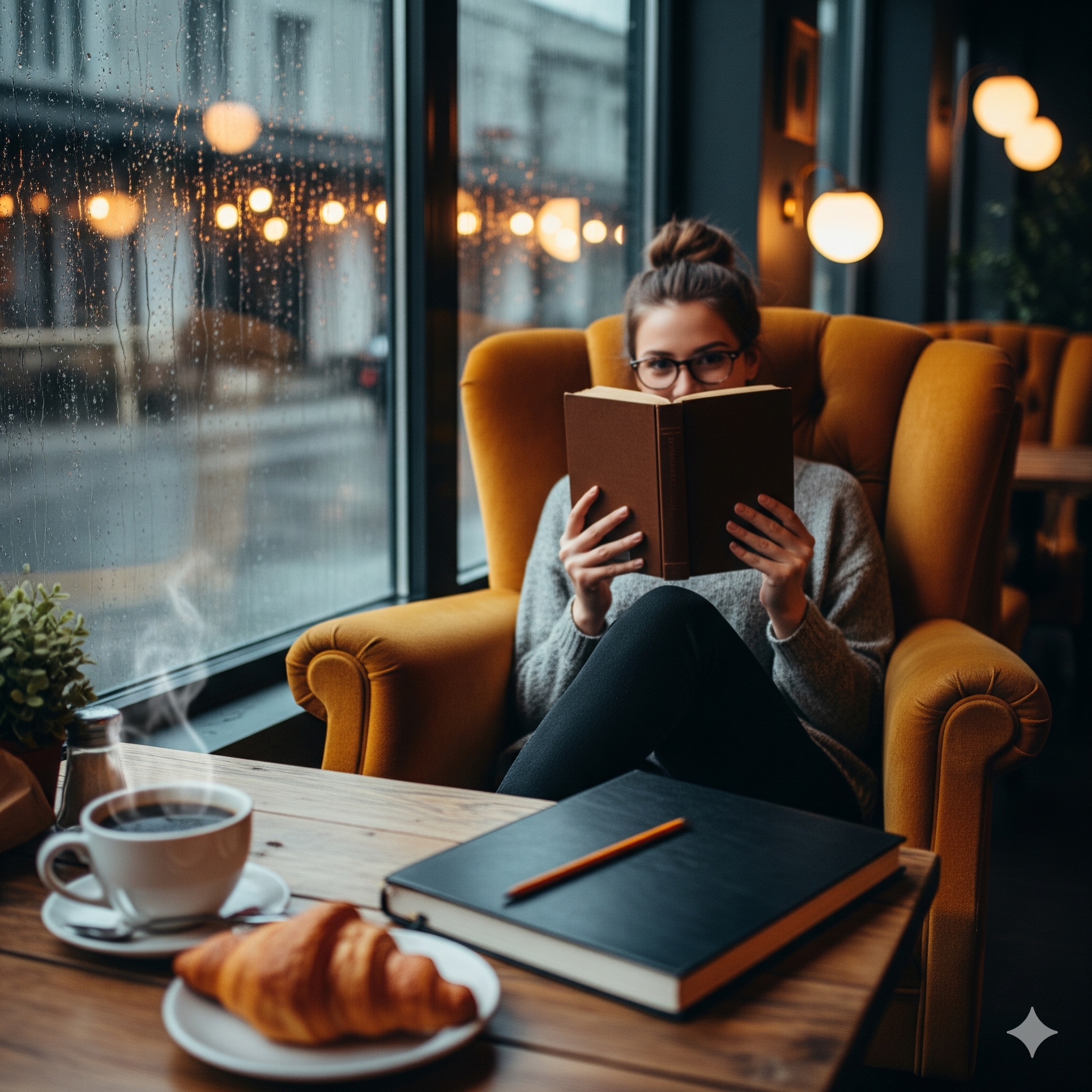 Over de gerafelde rand van het boek gluurt ze behoedzaam naar tafel vier, vlak bij het raam. De tafel is leeg. Pijnlijk leeg. Een golf van teleurstelling spoelt over haar heen. Normaal gesproken zit hij daar. Ze kent zijn naam niet, maar in de veiligheid van haar eigen gedachten noemt ze hem Arthur. Hij lijkt op een Arthur. Hij heeft donker, warrig haar dat altijd net iets te lang is en nonchalant over zijn voorhoofd valt. Hij draagt grofgebreide truien in herfstkleuren – mosgroen, roestbruin, diepblauw – die eruitzien alsof ze belachelijk zacht zijn en waarschijnlijk naar cederhout ruiken. Hij komt hier nu al drie maanden, stipt elke dinsdag en donderdag om acht uur. Zijn bestelling is altijd hetzelfde: een grote zwarte koffie en een croissant, waarvan hij de kruimels achteloos van zijn tafel veegt terwijl hij werkt. En hij werkt hard. Hij schrijft, of tekent, dat kan ze van deze afstand niet goed zien. Hij doet het driftig, geconcentreerd, gebogen over een dik, leren notitieboekje dat eruitziet alsof het al een heel leven achter de rug heeft.
