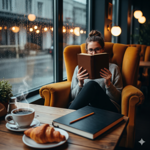 Zoals elke dinsdagochtend zit Elise in ‘Koffie en Boon’, haar favoriete toevluchtsoord in de stad. Het is een charmante hybride tussen een antiquariaat en een koffietentje, waar de geur van versgemalen bonen zich vermengt met het muffe, zoete aroma van oud papier. Ze zit op haar vaste plekje achterin, weggedoken in een grote, okergele fluwelen fauteuil waarvan de veren zachtjes protesteren als ze gaat verzitten. Op haar schoot ligt een exemplaar van De ondraaglijke lichtheid van het bestaan. Het is de honderdste keer dat ze het leest, of in ieder geval doet alsof. Want eigenlijk leest ze niet.