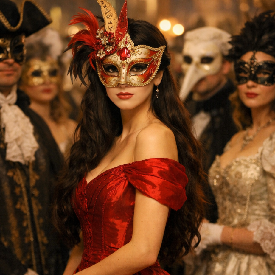 Ik besluit ze allemaal bij langs te gaan en via de kijkgaatjes te checken. Maar net als ik de lounge verlaat om de grote hal met de brede trap naar boven te betreden, hoor ik een bekend lachje. In de uiterste hoek van de lounge staat een groepje dames met de hoofden dicht bij elkaar te converseren en al gauw kan ik onderscheiden wie van hen Margareth is. Ze oogt alsof ze een totale gedaanteverwisseling heeft ondergaan. Haar lange donkerbruine haren zijn niet zoals gewoonlijk opgestoken maar dwarrelen als een waterval van krullen over haar rug tot op haar billen. Verder draagt ze een goudkleurig Venetiaans masker, getooid met kleurige veren. Haar na de geboorte van onze kinderen weer ranke lichaam is gehuld in een lange donkerrode wijd uiteenlopende jurk, met een net niet uitdagend maar toch zeer aanwezig decolleté.