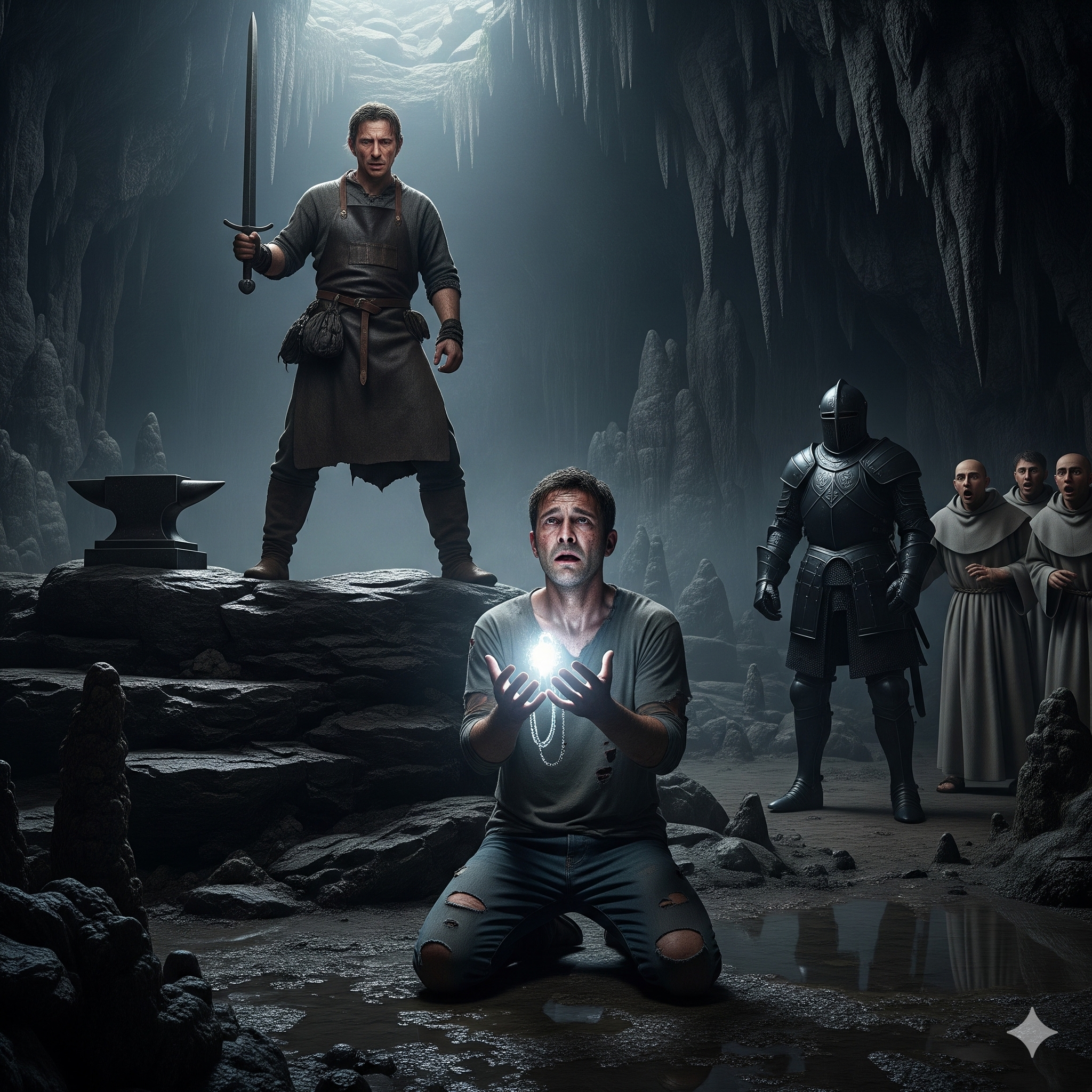 Wolf staart... en Wulfbehrt staart terug. De wereld lijkt te stoppen met draaien. Het geluid van de waterval, het hijgen van de soldaten, het gesnik van Mathilde... alles vervaagt tot een betekenisloze achtergrondruis. Er is alleen dit moment. Deze onmogelijke ontmoeting. Het is alsof ze in een spiegel kijken die niet het uiterlijk reflecteert, maar de ziel. Wolf ziet zijn eigen gezicht, maar dan harder, rauwer. Hij ziet dezelfde sterke, hoekige kaaklijn, dezelfde neus. Maar vooral ziet hij dezelfde donkere, intense ogen die branden van een vastberadenheid die de eeuwen overstijgt. Alleen zijn die ogen bij de smid ouder, dieper, getekend door littekens die Wolf nog niet heeft, door een leven van harde arbeid en brute strijd dat Wolf nooit heeft gekend. Hij kijkt naar de man die hij zou kunnen zijn. Of de man die hij is geweest. Een echo van zichzelf in een andere, hardere realiteit, gesmeed door een ander vuur.