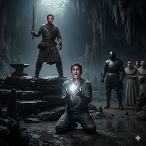Mechyel heft zijn handen, trillend van een onmenselijke woede, klaar om zich op de Graaf te storten, wapen of geen wapen. "Satan!" brult hij. Robert kijkt hem onbewogen aan, de minachting druipt van zijn gezicht als gif. Dan verlegt hij zijn aandacht. Hij negeert de razende priester en doet een stap in de richting van Wulfbehrt. Zijn zwaard hangt ontspannen aan zijn zijde, een gebaar van bedrieglijke vrede. "Smid," zegt hij, en zijn stem verandert van toon. Het arrogante randje maakt plaats voor een zalvende, redelijke klank. "Kijk naar deze waanzin. Kijk naar deze dwaze priester die alleen maar bloed en vuur wil." Hij spreidt zijn handen in een open gebaar. "Ik ben niet zoals de paters. Ik heb geen interesse in je ziel, je zonden of je verdoemenis. Ik ben een man van de wereld. Een man van zaken." Hij zet nog een stap dichterbij. "Wat mij betreft zijn jullie vrij om te gaan," vervolgt Robert zacht. "Jij en je vrouw. Je kunt deze grot verlaten, het bos in trekken en verdwijnen. Ik zal mijn mannen bevelen jullie niet te volgen. Geen brandstapel, geen marteling. Gewoon... vrijheid."