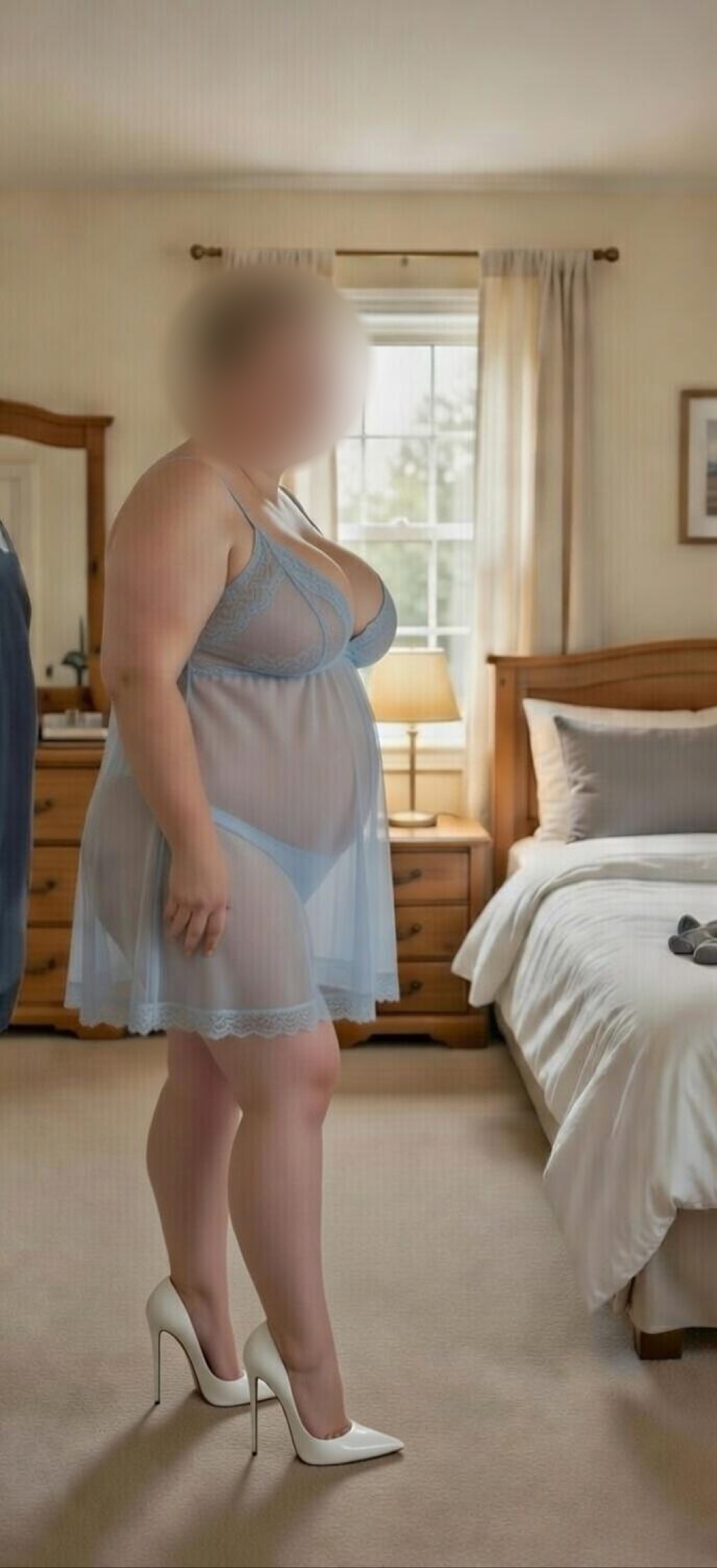 Daarna de witte pumps. Twaalf centimeter smalle hakken. Ik stapte erin, voelde hoe mijn kuiten strak aanspanden, hoe mijn kont iets meer naar achteren kwam, hoe mijn heupen vanzelf begonnen te wiegen. Ik liep een paar passen door de kamer, hoorde het zachte tikken van de hakken op de houten vloer, voelde hoe mijn borsten zachtjes mee bewogen, hoe de stof over mijn tepels schuurde bij elke stap – een zoete, lichte pijn die me nog natter maakte.