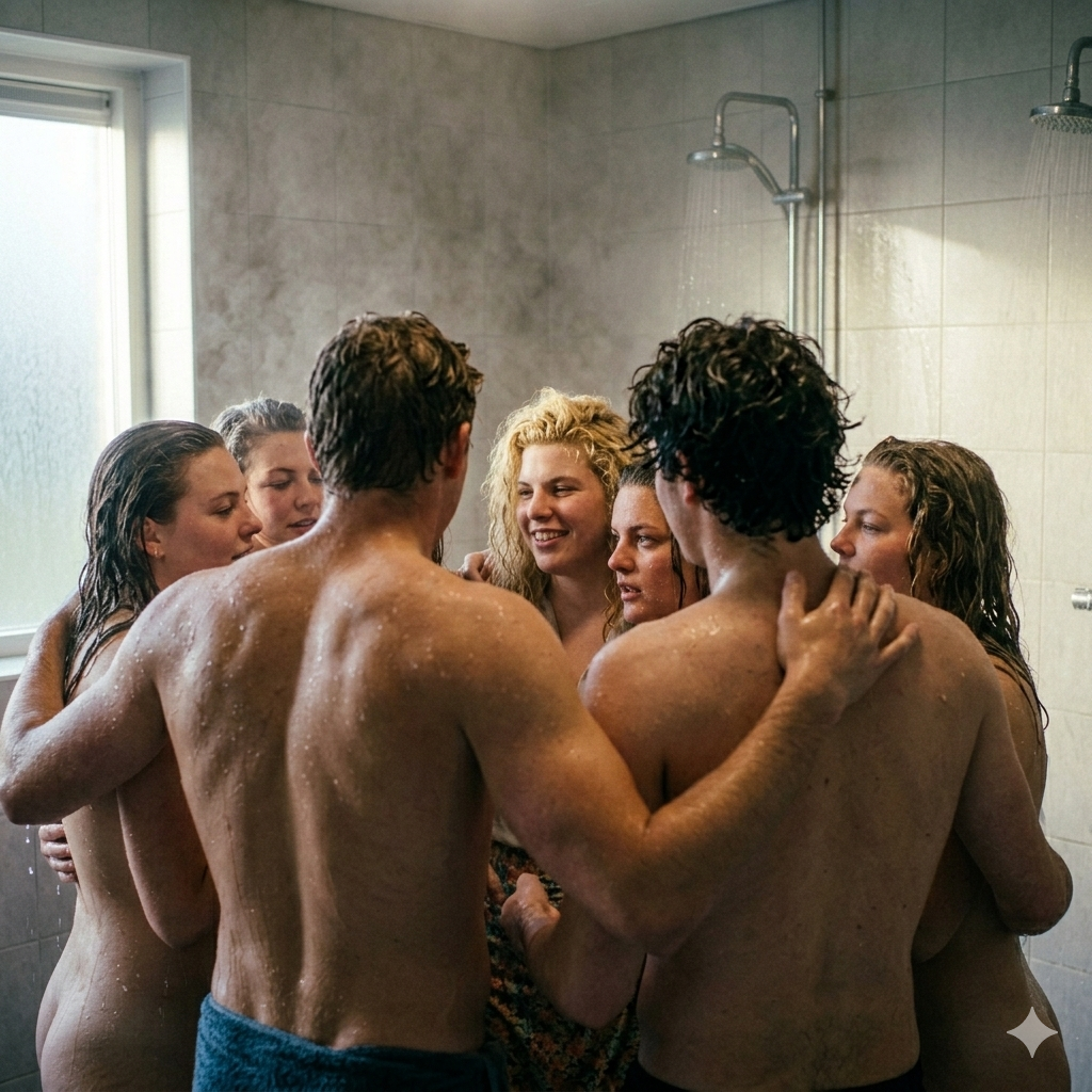 De verplaatsing naar de badkamer was een vreemde, bijna ceremoniële processie van zeven naakte lichamen. We liepen in een houterige ganzenpas door de gang, de vloer koel onder onze voeten terwijl de ochtendzon inmiddels felle banen licht door de ramen wierp. De geur van de woonkamer — die zware mix van seks en overwinning — hing nog om ons heen als een onzichtbare deken.