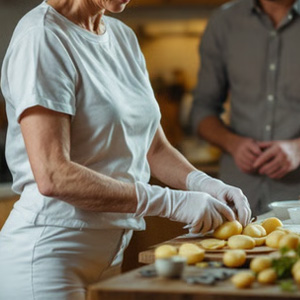 De manier waarop ze haar handen beweegt, langzaam en sensueel, maakt hem gek. De handschoenen zitten strak en plakken om haar handen, benadrukkend elke lijn en curve. Het latex glanst in het licht, waardoor het bijna onwerkelijk lijkt. Hij voelt een apart gevoel in zijn maag, een mengeling van opwinding en verlangen. De simpele handeling van aardappels schillen wordt in zijn ogen iets bijzonders, iets dat zijn fantasie prikkelt. Hij kan niet helpen maar staren, gefascineerd door de manier waarop het latex haar handen omhult, de glans die zijn aandacht trekt. Het is alsof de tijd even stilstaat, en hij is volledig in haar ban.