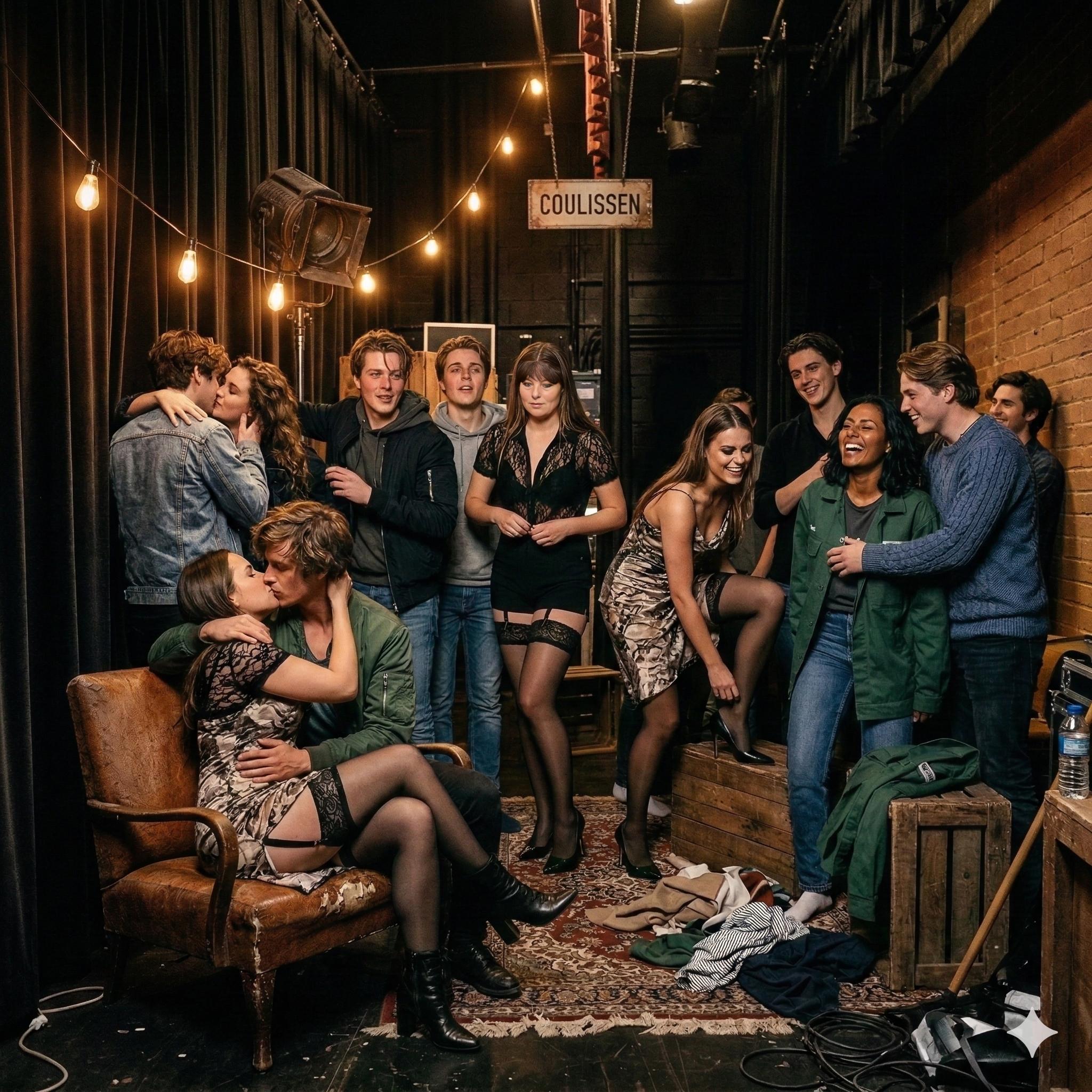 Zijn gezicht kleurde nu opnieuw diep bordeauxrood. Hij leek even te twijfelen, alsof de realiteit van wat er aan de andere kant van dat gordijn zou kunnen gebeuren hem plotseling overviel. Zijn handen trilden lichtjes op de tafel. Maar de aansporingen van zijn maten en de herinnering aan de uitdagende blik van Rianne gaven hem het laatste zetje. Hij vermande zich, stond langzaam op en vertrok met een snelle, schichtige pas richting de coulissen.