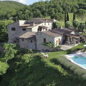 We lopen van kamer naar kamer, openen de luiken en laten het gouden Toscaanse licht binnenstromen. Buiten ligt het privézwembad iets lager, omringd door slanke cipressen, met een adembenemend uitzicht over eindeloze groene wijngaarden die glooien tot aan de horizon. In de verte zien we de rode daken van een klein dorpje.