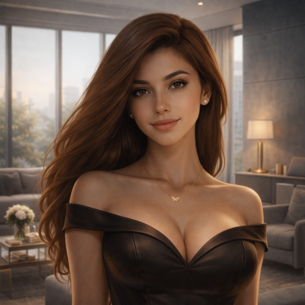Haar gezicht is zacht en symmetrisch opgebouwd, met amandelvormige ogen die half geloken zijn en een blik dragen die zowel rustig als afwachtend is, een rechte, verfijnde neus die naadloos in haar gelaat overgaat, en volle lippen die net een fractie openstaan, alsof ze zich al voorbereidt op het eerste contact, op het eerste woord of zelfs alleen zijn blik.