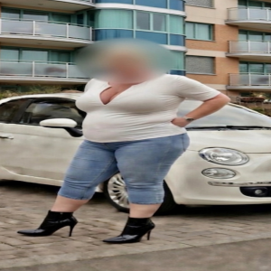 André begint me uit te kleden. Zijn vingers pakken de zoom van mijn witte T-shirt en trekken het langzaam over mijn hoofd. Mijn zware borsten komen vrij, vol en zacht, met harde tepels die naar hem smachten. Hij kreunt zachtjes en buigt zich voorover om er een te kussen, zijn tong warm en nat. Dan maakt hij mijn jeans open, schuift ze over mijn heupen, over mijn dikke kont, en laat ze zakken tot op mijn enkels. Ik stap eruit, alleen nog in mijn zwarte string en die glanzende laklaarsjes met de hoge hakken. Hij kijkt naar me alsof ik een kunstwerk ben. „God, Anita… je bent perfect. Elke ronding, elke centimeter van je lichaam maakt me gek.“