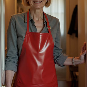 Ruben scant haar snel met zijn ogen. Ze ziet er mooi en feestelijk uit zo in haar jurk. Ze is alleen haar rode plastic schort vergeten af te doen. Wat meteen een kleine tinteling in zijn piemel geeft. Rood glanzend PVC. Hij denkt niet dat Heleen zich ervan bewust is dat ze per ongeluk haar schort nog aangehouden heeft. Maar voor hem is het een perfecte binnenkomer!