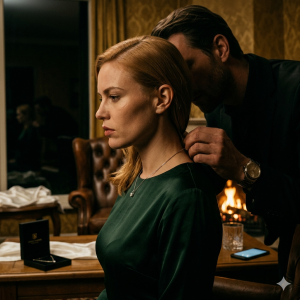 "Het werk slokt me de laatste tijd veel te veel op. Ik voel me schuldig dat ik je zo vaak alleen laat in dit grote huis." De schaamteloze leugen trekt een strakke knoop in mijn maag. Hij voelt zich helemaal niet schuldig over mijn eenzaamheid; hij gebruikt dit verzonnen schuldgevoel simpelweg als dekmantel voor de uren die hij gisteren met haar doorbracht. Hij haalt een zwart, fluwelen sieradendoosje tevoorschijn. Het gouden logo van een bekende juwelier glanst in het licht van de schemerlamp. "Dit zag ik in een vitrine op de luchthaven," zegt hij, terwijl hij het doosje naar me uitsteekt. "Het deed me aan jou denken."