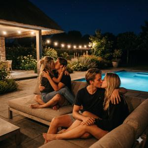 Tommie, die nog steeds met grote ogen naar de rietgedekte luxe om zich heen zat te kijken, aarzelde geen moment. Hij verschoof over de loungebank naar Rianne toe. De overgang was natuurlijk; de band die ze aan de dijk hadden gesmeed, was hier in de stad niet minder geworden. Even later lagen ze al intiem te kussen, verstrengeld in de diepe kussens van het terras, terwijl de blauwe gloed van het zwembad hun contouren verlichtte.