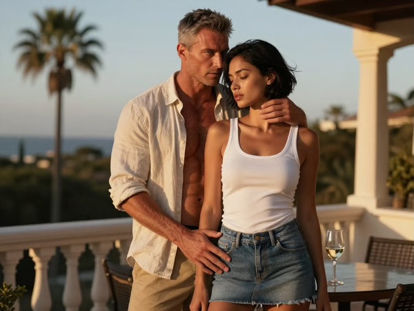 Als ze bukt, ziet hij haar donkere lipjes glimmen, schaamlippen slaan open onder haar korte pijpje. Hij loopt naar haar toe, trekt haar overeind, draait haar rug naar zich toe. Zijn handen glijden over haar heupen. “Dokter …” ademt ze. “Zeg mijn naam,” sist hij. “J-Johan …” “Klaar voor je eerste les?” Ze knikt, hals bibberend. Hij duwt haar voorover over de leuning van de veranda. Het hout drukt in haar buik. Ze krijgt haar benen wijd, hij trekt haar slipje omlaag, laat het rond haar enkels bungelen. Zijn vingers vinden haar natte gleuf, spreiden haar lipjes. “Kleine Aziatische kut,” mompelt hij. “Strak als een drumvel.”