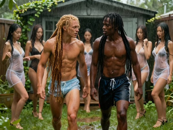 Peter gaat als eerste vooruit. Hij loopt op de brunette af die net tegen hem had geleund bij de vijver, zet twee vingers onder haar kin en tilt haar gezicht iets omhoog. Haar ogen zijn donkerbruin, bijna zwart onder de druipende wimpers. "Als jullie willen, gaan we jullie drogen," fluistert hij. Zijn stem klinkt diep, de r tussen zijn tanden gerold als een kustgolf. Maar hij doet geen stap achteruit; zijn vingers glijden via haar hals naar haar sleutelbeen, duwt het natte katoen opzij. De stof schuift over haar tepel, een zacht wrijving die haar mond opendraait. Raymond ziet het moment dat haar verzet knapt: ze slaakt een hijg, haar knieën schokken. "Achter het schuurtje is alles privé," zegt Peter terwijl zijn duim over haar stijve kam strijkt.