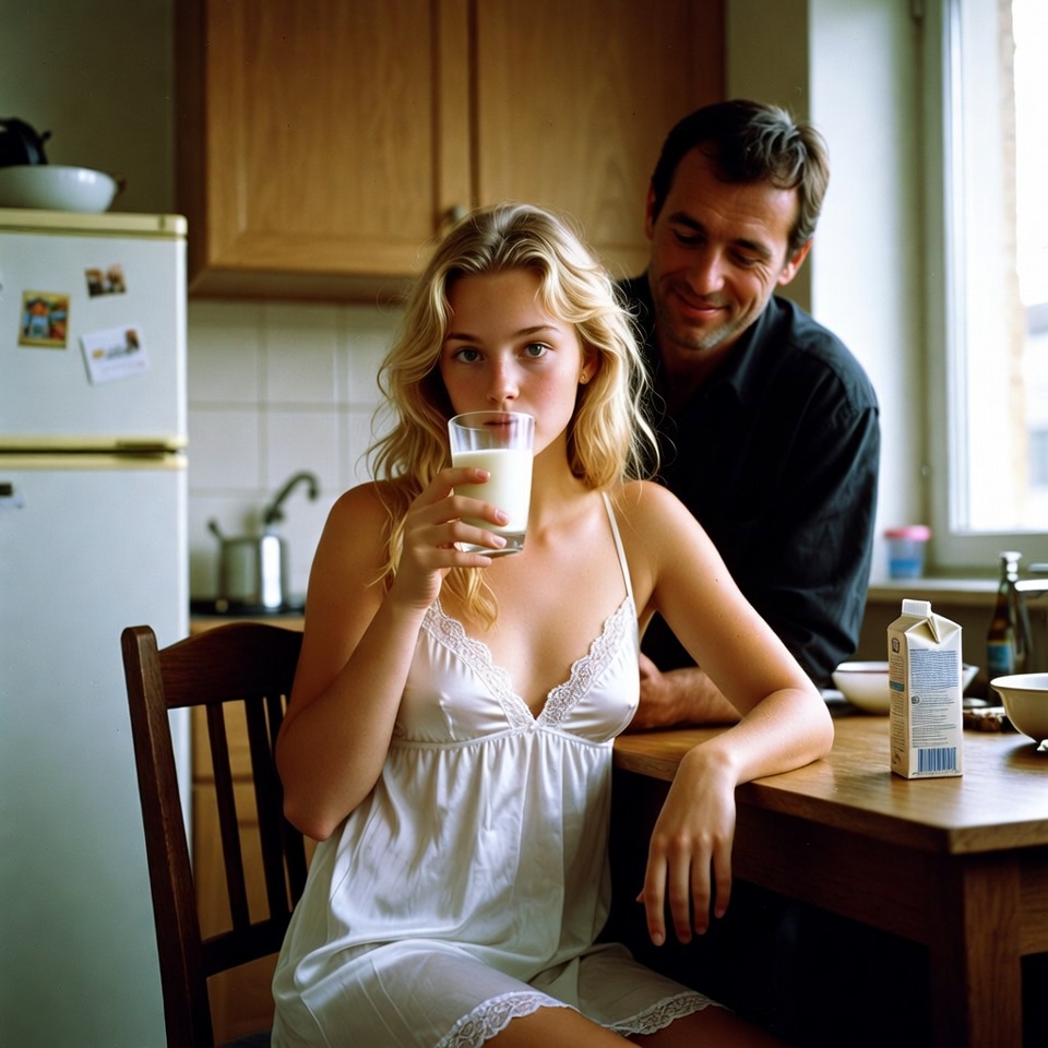 Lachend riep ik "OK!" maar ik was absoluut niet van plan om dat te gaan doen. Ik ging naar binnen en begon me uit te kleden om naar bed te gaan, toen ik een vreemd geluid hoorde in de keuken. Ik ging op onderzoek uit, even vergetend dat ik alleen maar een doorschijnende nachtjapon aanhad met een blauw slipje eronder. Ja hoor, het was Papa, hij maakte een beker warme melk voor zichzelf, omdat hij niet kon slapen, en hij vroeg mij of ik er ook een wilde.