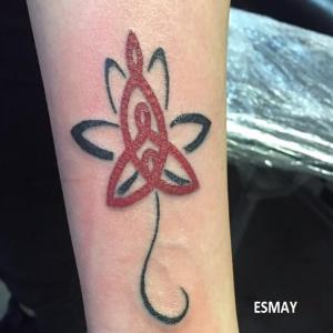 Mmmm oh ja ik was net heftig klaargekomen en ook nogal verbaasd toen Aurora me zei dat ik zelfs wat had gesquirt!! Toen ik haar kuste rook en proefde ik mezelf, ik ken de geur en ook de smaak van mijn eigen kutje. Na die kus richtte Aurora haar aandacht op mijn tattoo, ‘jee Esmay wat een mooie tattoo heb je daar!’ zei ze en bekeek deze uitgebreid. Ik ben best trots op mijn tattoo en legde haar ( en nu ook jullie lezers) ook meteen uit waarom ik die heb laten zetten. Ik ben geboren met een soort van vervelende wijnvlek aan mijn linkerarm, het meeste ervan zit in mijn oksel maar een groot gedeelte is ook aan de rand zichtbaar op mijn linker bovenarm en deels ook wat richting mijn borst. Ik schaamde mij als kind daar altijd voor en maakte mij vaak onzeker over mijn lichaam, voorál toen ik ouder werd richting jongens toen ik de puberteit in ging. Ik heb er nooit heel vervelende opmerkingen over gehad maar toen ik wat met Jim kreeg en ik voor het eerst met hem naar bed ging, was ik tóch een beetje nerveus! Achteraf was dat nergens voor nodig, Jim stoorde er zich totaal niet aan…’het maakt jou niet minder aantrekkelijk en hoort gewoon bij jou’ zei hij lief! Na een paar jaar relatie hadden we in 2017 een keer een financiële meevaller en kwamen we op het idee om allebei een mooie tattoo te laten zetten. Ik had het jaar daarvoor al eens een mooi klein symbool op mijn linker onderarm laten zetten, nu wilde ik iets speciaals en groot genoeg om mijn wijnvlek te coveren. Via een goede vriend van Jim iemand opgezocht die samen met ons een ontwerp maakte en het daarna in twee keer zette, het was pijnlijk maar het eindresultaat was zó mooi…en nu nog steeds! De wijnvlek werd grotendeels bedekt met lichtrode rozen die overliepen in mooie blauwe takjes en bladeren die zich rond de afbeelding van de kop van een leeuw/leeuwin, geen verrassing voor jullie omdat ik Shadow al eens een foto ervan gestuurd heb en deze bij onze verhalen zichtbaar is hihihi. Vlak eronder liet ik een maand later nog een grappig zonnetje er bij zetten.