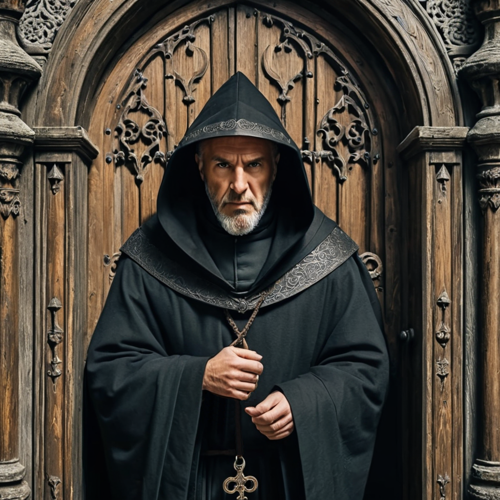 De poort draait voorzichtig op een kier. We zien een man met een zwart habijt waarvan de kap diep over zijn hoofd is getrokken. Een uitgemergeld gezicht met bloeddoorlopen ogen die ons lijken te vervloeken voor het doorbreken van de rust, kijkt ons een voor een aan. Uiteindelijk blijft hij me aanstaren, alsof hij aanvoelt dat ik degene ben die de oorzaak van dit ongewenste bezoek is.